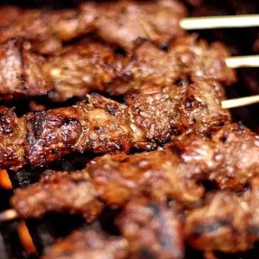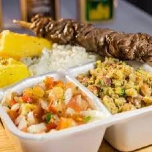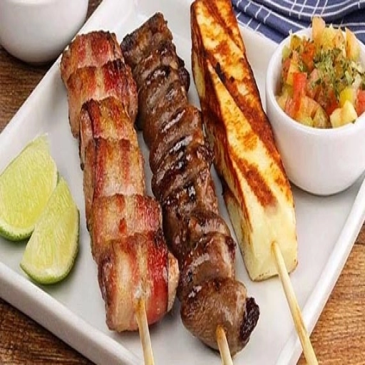 Espetinho de carne, Bacon em tiras Arroz, Mandioca, Farofa, Vinagrete