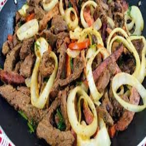 Bife suculento, Cebola, Arroz, Vinagrete, Mandioca